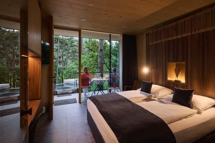 Forest Village Theodosius is a unique 4-star glamping retreat nestled in an ancient pine forest at the edge of Vrhpolje village, overlooking the majestic Vipava Valley. Nine individually designed wooden cabins blend seamlessly into the rocky terrain, each offering a private hot tub, with several also featuring an indoor sauna. All chalets are equipped with a fridge, coffee maker, kettle, television, and free WiFi. Guests wake to a rich breakfast and can dine at the on-site Theodosius restaurant, which pairs regional cuisine with exceptional Vipava wines. The resort is an ideal base for wine tours, paragliding, rock climbing, canoeing, and day trips to Predjama Castle and the Škocjan Caves.